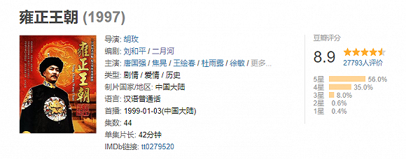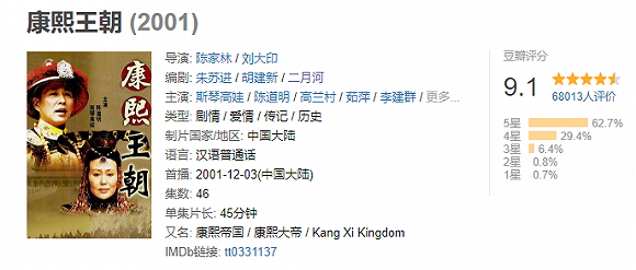 而在那个IP概念还未诞生的时代里,二月河的这些小说构成了影视剧的经典素材,成为几代人的回忆。不仅如此,这种浑厚的历史气韵也打动了台湾观众,据统计,电视剧《雍正王朝》在16年内,台湾回放高达17次;《康熙王朝》的收视率一度达到2.8,超越了《武则天》和《大宅门》。