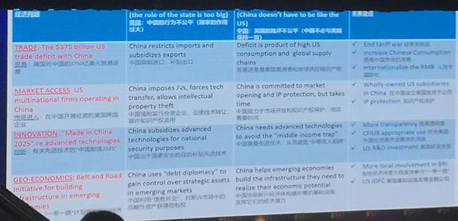Geoffrey Garrett还从贸易、市场进入、创新、地缘经济学等方面阐述了中美的分歧点以及他的建议。(详见下图:Geoffrey Garrett演讲幻灯片)