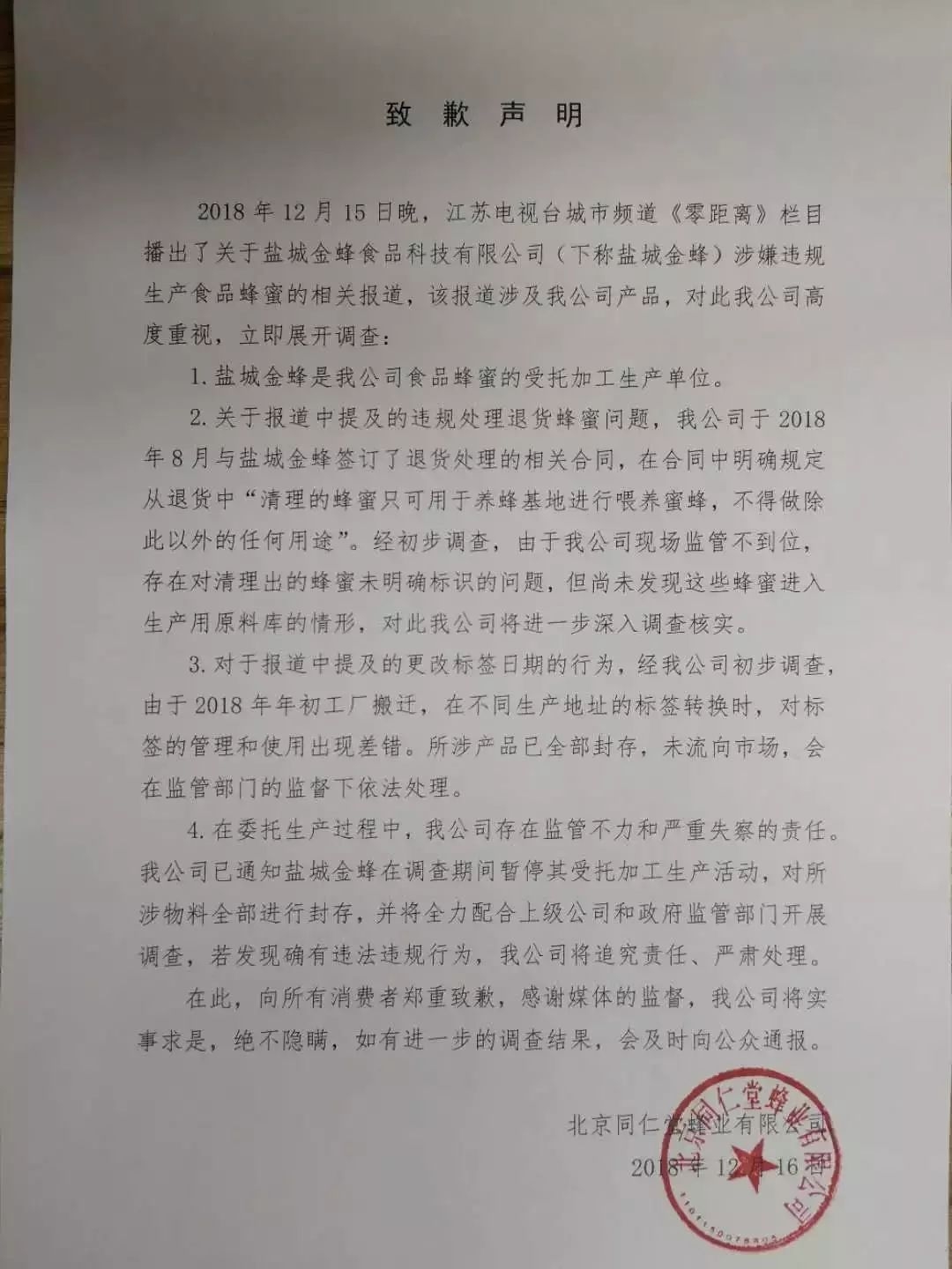 12月16日上午,北京同仁堂蜂业有限公司在其官方微信公众号发布致歉声明,企业称自身存在监管不力和严重失察的责任,已通知盐城金蜂在调查期间暂停其受托加工生产活动。但尚未发现这些蜂蜜进入生产用原料库的情形,将进一步深入调查核实。此外,“对于报道中提及的更改标签日期的行为,所涉产品已全部封存,未流向市场,会在监管部门的监督下依法处理”。