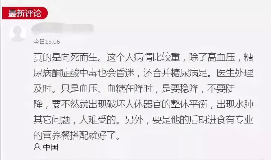 老婆心疼我,一大早给我买了烩面上来吃。吃完两小时测血糖,高达20多……又被医生批评,说我乱吃东西……打了一上午吊针,主要是扩管、降压的……