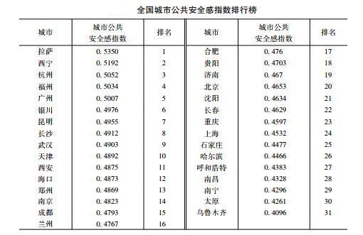 根据12月15日中国应急管理学会、中国矿业大学、社会科学文献出版社联合在北京发布的《公共安全感蓝皮书:中国城市公共安全感调查报告(2018)》,2018年全国城市公共安全感指数最高的是拉萨,其次是西宁,杭州、福州分别位居第三、第四位。四大一线城市都没进入前四位。唯一好一点的广州,仅仅为全国第五位。北京仅仅位居全国第二十位。