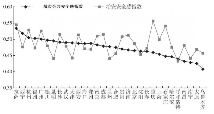 以公共安全感指数为标线,治安安全感指数曲线围绕公共安全感指数曲线呈现上下波动。治安安全感和公共安全感是相脱离的,表明除治安安全因素外,公共安全感受到公共场所设施安全、生态安全、社会保障安全等多重因素的综合影响。