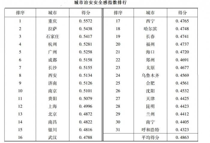 上述报告,对2018年各个城市的治安安全感指数按高低顺序排名,从第1到第31的城市分别是:重庆、拉萨、石家庄、杭州、广州、成都、长沙、西安、济南、南京、贵阳、上海、北京、南昌、银川、武汉、西宁、哈尔滨、长春、福州、海口、郑州、太原、乌鲁木齐、合肥、沈阳、天津、昆明、兰州、南宁、呼和浩特。