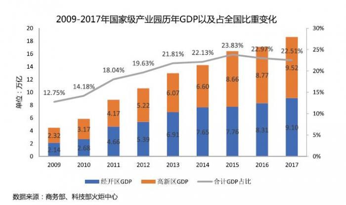 报告指出,国家级经济技术开发区和国家级高新技术产业开发区是国家级产业园区中最具活力的热点区域。截止2017年底,全国共有219家国家级经开区和156家国家级高新区,实现地区生产总值18.62万亿元,其中经开区9.10万亿,高新区9.52万亿,合计占全国GDP比重达到22.51%。