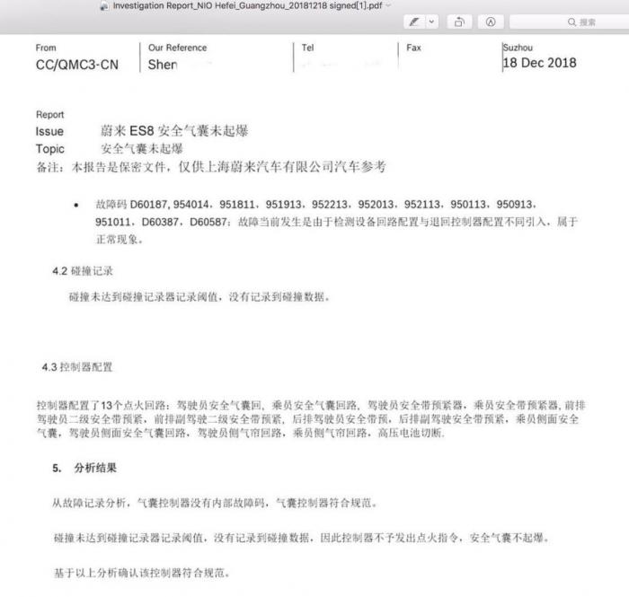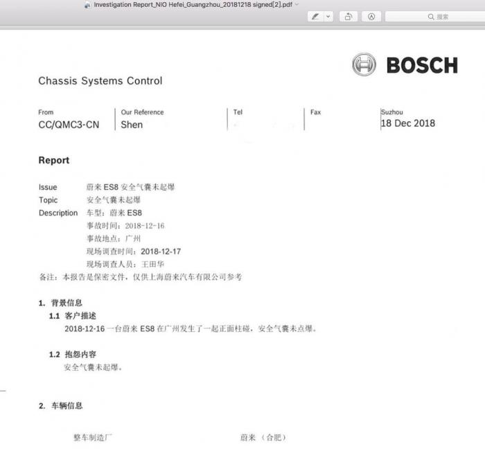 蔚来汽车表示,与ACM(安全气囊控制模块)供应商博世公司技术人员于事发后迅速赶到广州,对车辆做了详细检查,检测已于12月18日中午完成。