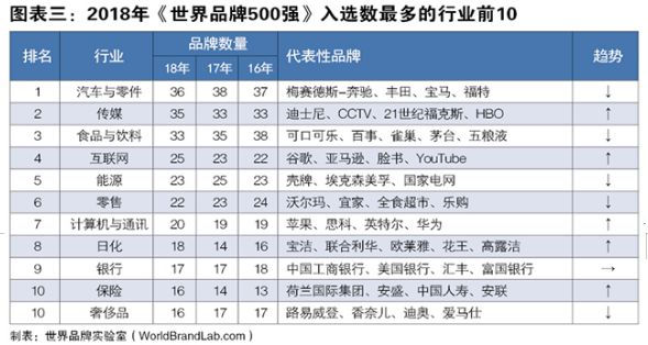 汽车与零件行业共有36个品牌入榜,排名继续保持第一;