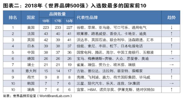 法国和英国分别有43个和42个品牌上榜,分列二三位;