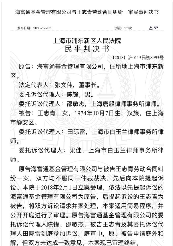2016年4月,40岁出头的王某青在海富通基金的职务被调整为首席人才官,基本月薪为9.6万;此前,她的职务是人力资源总监,已在这家机构工作了13年。