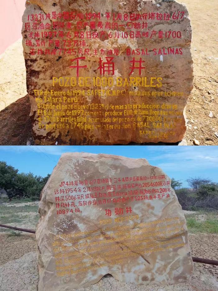 在这四口井之一的功勋井——千桶井纪念碑前,我看到碑上记录着这样的文字:1994年1月8日执行塔拉拉6/7区执行合同以来日产量最高的一口新井。该井于1997年6月8日投产,6月10日达到日产1700桶。