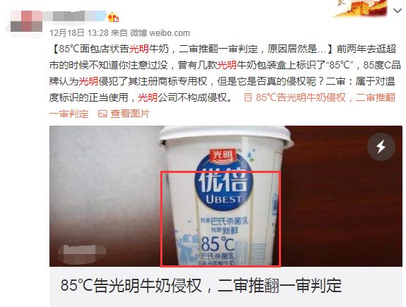 原本是一起简单的商标纠纷,在经过媒体曝光后引起了网友的热议。12月19日下午,网友们把“光明被85度C告了”话题送上了微博热搜第一,展开了大量的讨论,还出现了许多“神评论”。数据显示,该话题的阅读已达2亿,讨论有1.1万。从评论来看,一些网友认为85度C此举是在蹭热度和“碰瓷”。
