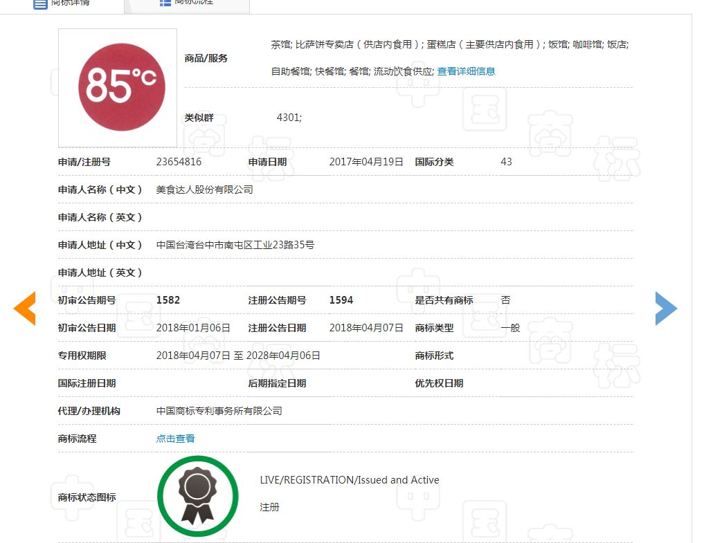 不过,美食达人公司于2003年创立85度C品牌,先后取得四个“85℃”注册商标且均在有效期内,经过多年宣传和使用,其在第43类咖啡馆、蛋糕店等的注册商标被中国商标局认定为驰名商标。