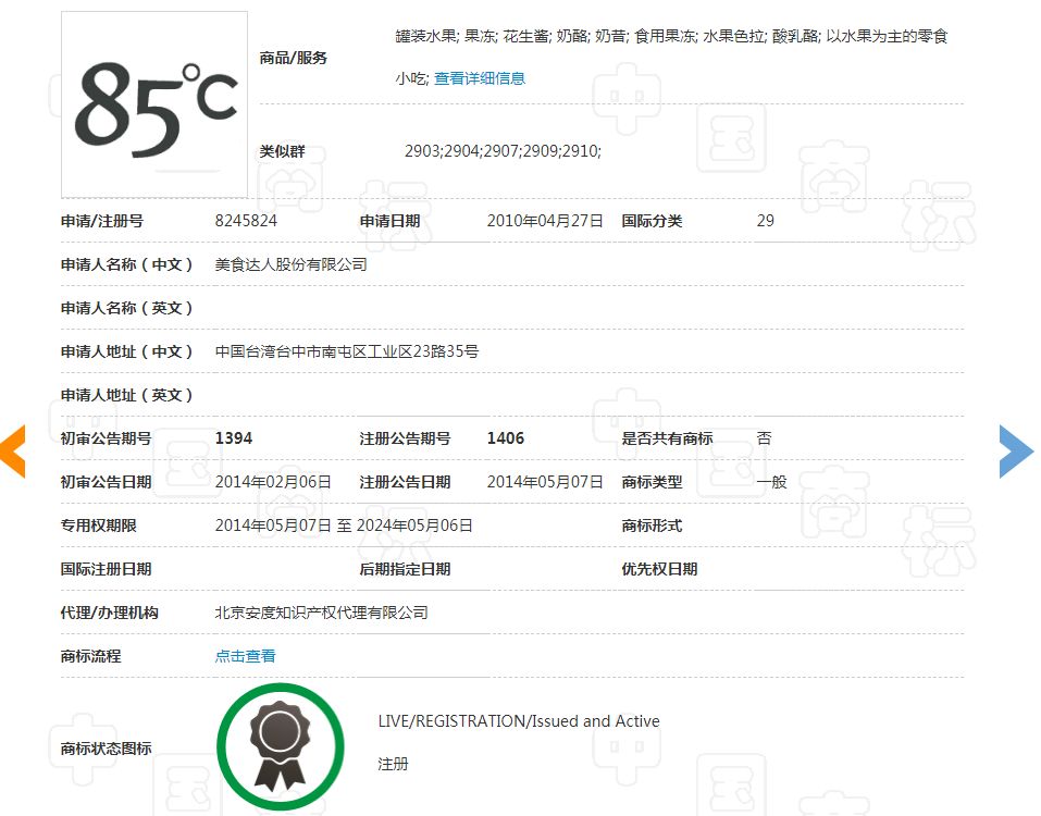 每日经济新闻(微信号:nbdnews)记者在国家工商行政管理总局商标局官网查询发现,美食达人股份有限公司还曾在2014年和2016年申请过“85”、“八五”等商标。