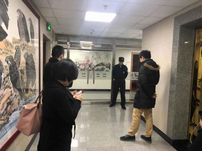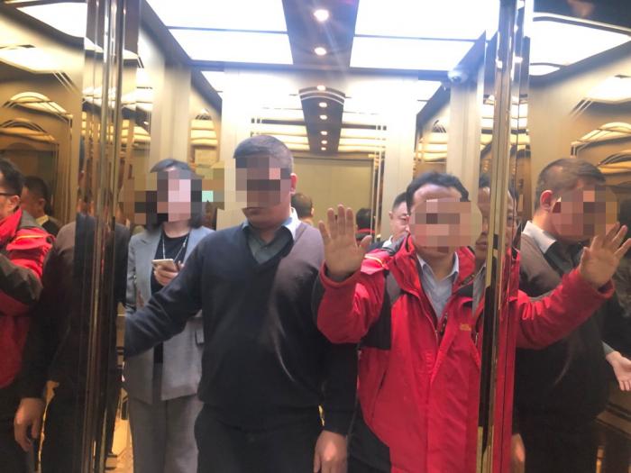 (洛娃科技董事长胡克勤在随行人员陪同下进入电梯,记者被阻挡在外)
