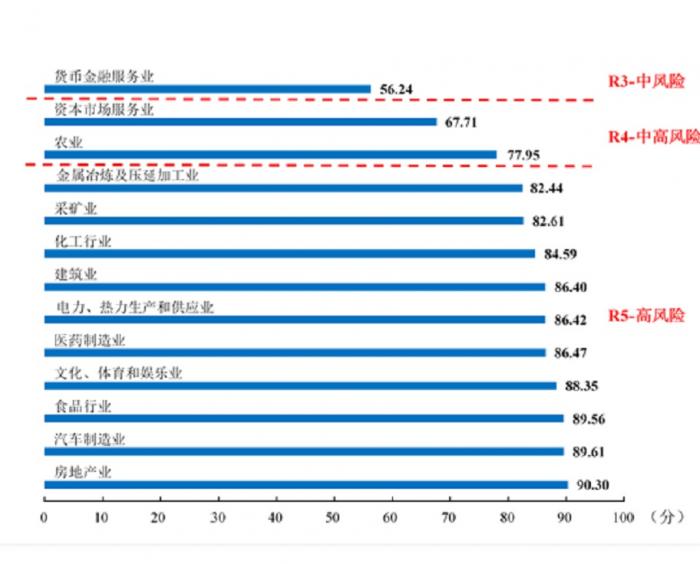 从行业分布来看,贸易金融服务业、资本市场服务业、农业行业社会环境管治风险较小,分别处于中风险、中高风险水平。金属冶炼以及压延加工业、采矿业、化工行业、建筑业、电力热力、医药制造业、文化体育以及娱乐业、食品、汽车制造、房地产行业则处于高风险水平。