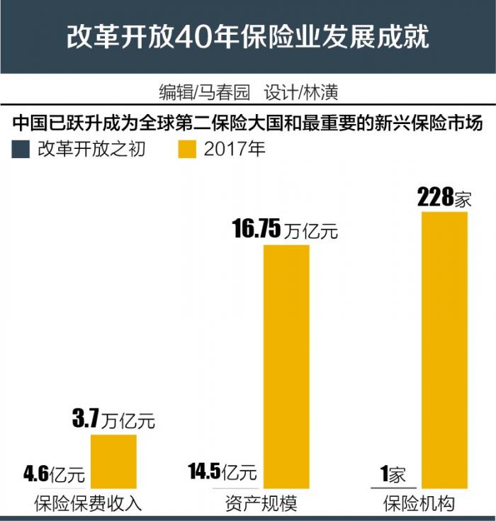 改革开放40年以来,保险业发展的成就举世瞩目。从改革开放之初至2017年,保险保费收入从4.6亿元增加到3.7万亿元,资产规模从14.5亿元增加到16.75万亿元,保险机构从1家增加到228家,我国已跃升成为全球第二保险大国和最重要的新兴保险市场。