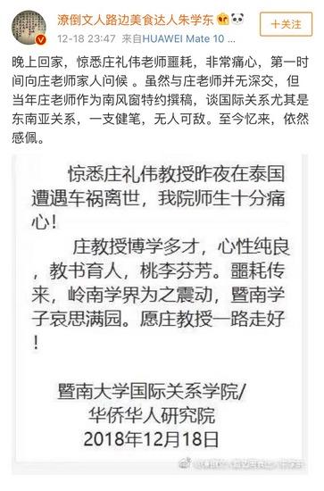 “庄教授博学多才,心性纯良,教书育人,桃李芬芳。噩耗传来,岭南学界为之震动,暨南学子哀思满园。”12月18日,暨南大学国际关系学院在微信公众号上发布消息称,该院教授庄礼伟于12月17日夜在泰国遭遇车祸离世。