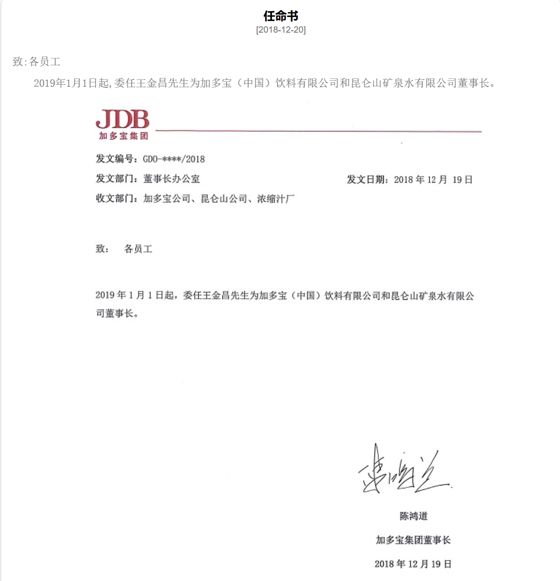 12月20日,加多宝在官网发布新的董事长任命书。据悉,自2019年1月1日起,中粮包装前董事会主席王金昌将出任加多宝(中国)饮料有限公司和昆仑山矿泉水有限公司董事长。