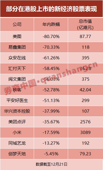 小米、美团最大的两家新经济IPO企业双双破发,一个跌17.59%,一个跌35.67%。平安好医生、映客、汇付天下等遭腰斩;美图、众安在线、阅文集团、易鑫集团等去年资本扎堆的新经济的代表公司,今年跌幅均超过50%。美图的市值更是从巅峰时期的近千亿港元跌至不足百亿,跌势可谓凶猛。