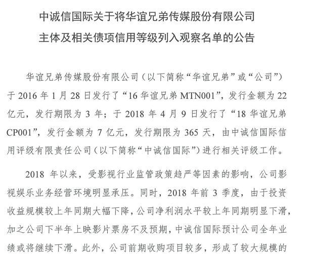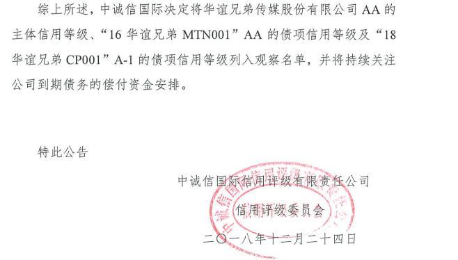 12月24日,评级机构中诚信国际发布公告称,决定将华谊兄弟传媒股份有限公司AA的主体信用等级、“16华谊兄弟 MTN0O1”AA的债项信用等级及“18华谊兄弟CPO01”A-1的债项信用等级列入观察名单,并将持续关注公司到期债务的偿付资金安排。