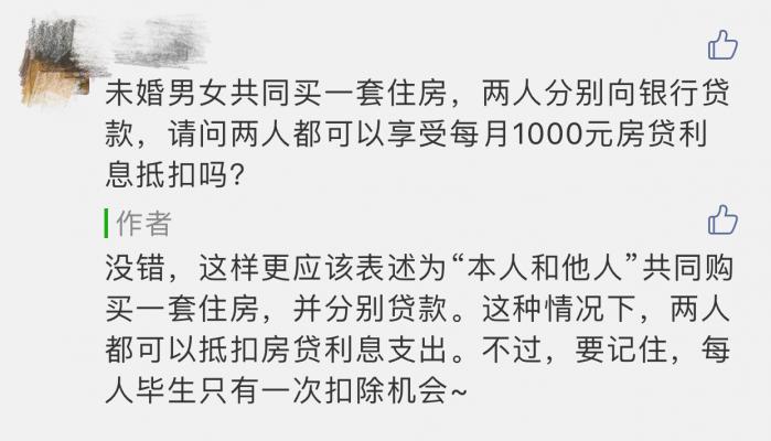 这位朋友今年刚结婚,其配偶名下也供有一套房。这位朋友很关心:如果婚前两人都有房贷,婚后还能继续各自享有1000元/月的扣除吗?答案是:不可以!