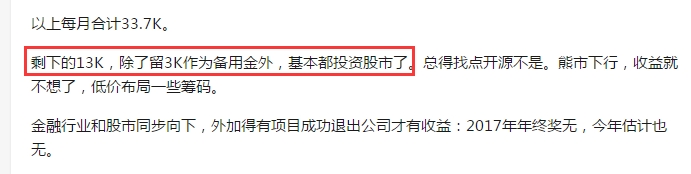 在知乎帖主的账单中,其每月各项花费合计约3.37万元,还剩下大约1.3万元,不过其大约每月往股市投1万元,导致其只剩下3千元作为备用金,相较于每月数万元的薪酬而言,近乎“月光”。