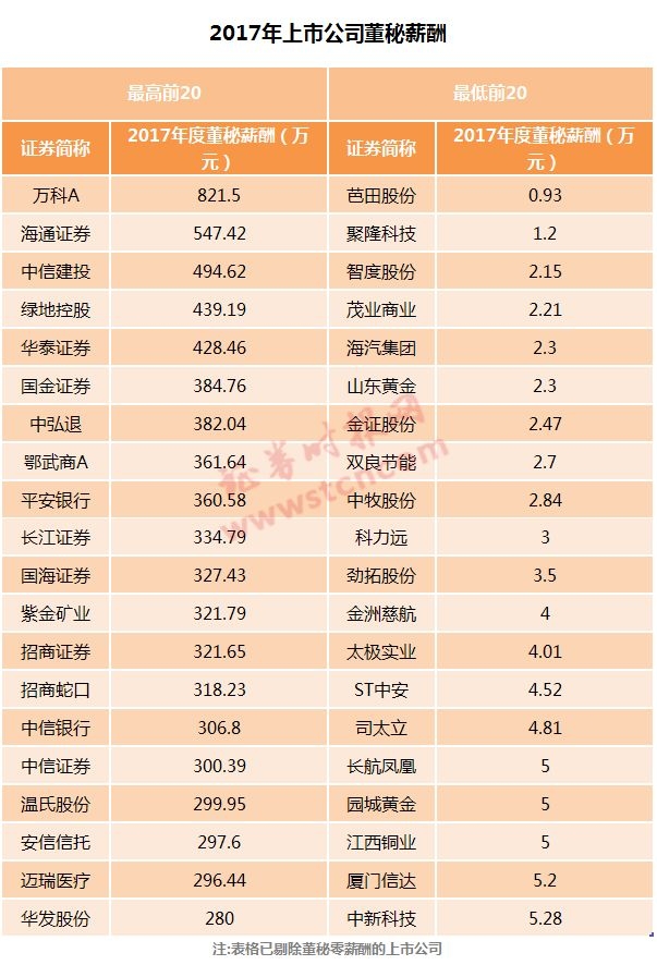 董秘是一个高收入群体,这一点毋庸置疑。数据显示,2017年度A股公司年薪超过百万元的董秘就有153位。在上述董秘中,年薪最高的是万科董事朱旭,2017年度薪酬达到821.50万元。其次为海通证券的姜诚君,当年姜诚君的年薪为547.42万元。不过,统计数据也表明,2017年度,仍有1013家上市公司董秘年薪低于50万元,其中芭田股份等15家上市公司的董秘年薪甚至不到5万元。