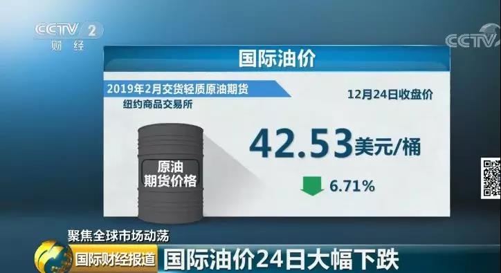 市场担忧全球经济增长放缓及供应过剩,再叠加美股大跌因素,国际油价24日大幅下跌。纽约商品交易所2019年2月交货的轻质原油期货价格下跌6.71%,收于每桶42.53美元。这是自2017年6月以来纽约油价首次跌破43美元。自今年10月份冲高突破76美元以来纽约油价已经下跌超过44%。