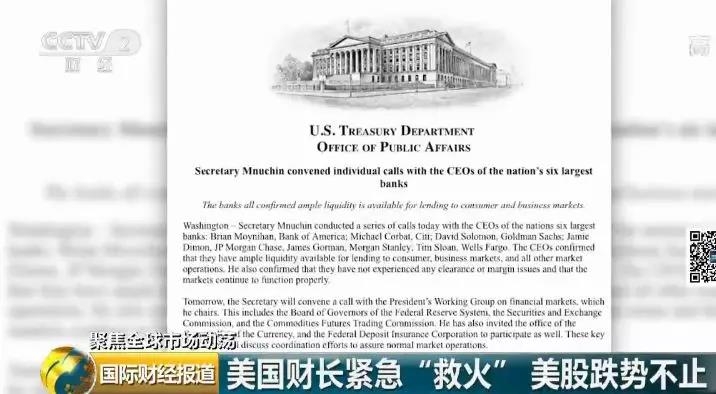 在美股三大指数集体遭遇金融危机以来最“糟糕一周”后,美国财政部长姆努钦上周日亲自致电美国六大银行首席执行官,过问市场流动性情况,还放风要同“救市国家队”会谈。
