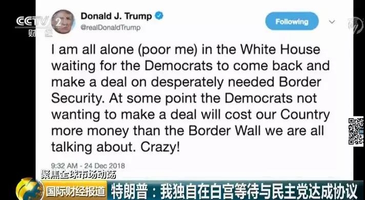 除了美联储,让特朗普头疼的还有他与民主党在美墨边境建隔离墙经费问题上的僵局。当天上午,特朗普再次在社交媒体上写到,“可怜的我独自一人在白宫等着民主党回来,就亟待解决的边境安全问题达成协议,在某些情况下,民主党不想达成协议才会消耗我们国家更多的钱,比我们讨论的修建边境墙所需要的更多,疯狂!”