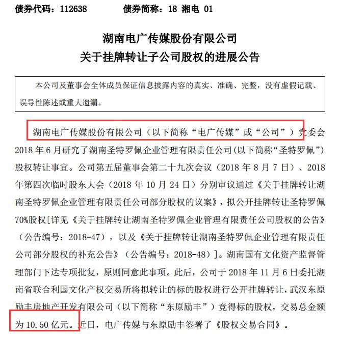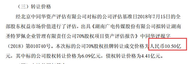 根据公开挂牌结果,电广传媒将本合同项下转让标的以人民币 10.50 亿元转 让给东原励丰。转让价格包括转让方持有的标的股权的价格,即 6.09 亿元;以及转让方对标的债权的价格,即 4.41 亿元。