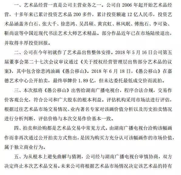 12月15日,电广传媒发布公告称,公司子公司,湖南省有线电视网络(集团)股份有限公司拟将《愚公移山》布面油画以 2.088 亿元的价格出售给湖南广播电视台。