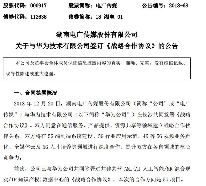 电广传媒在公告中强调,这是华为第一家跟全国广电系统签署的共同进军5G领域的战略合作协议。