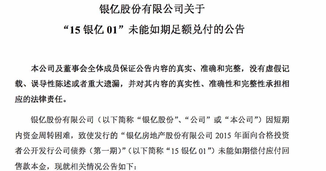 12月24日,银亿股份发布公告称,因短期内资金周转困难,致使发行的“银亿房地产股份有限公司2015年面向合格投资者公开发行公司债券(第一期)”(以下简称“15银亿01”)未能如期偿付应付回售款本金。本期债券发行规模为3亿元人民币。