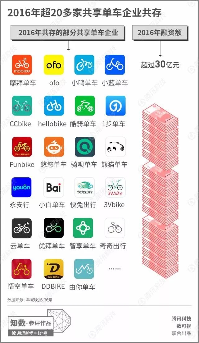 2016年有超过20多家共享单车企业共存。同时,各公司纷纷融资,一年间,共享单车行业融资额超过了30亿元,除了ofo、摩拜以外,小鸣单车、小蓝单车等中小规模企业迅速崛起。