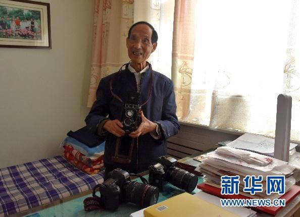 李汉朝和他使用过的相机。(新华社记者 段敏夫 摄)