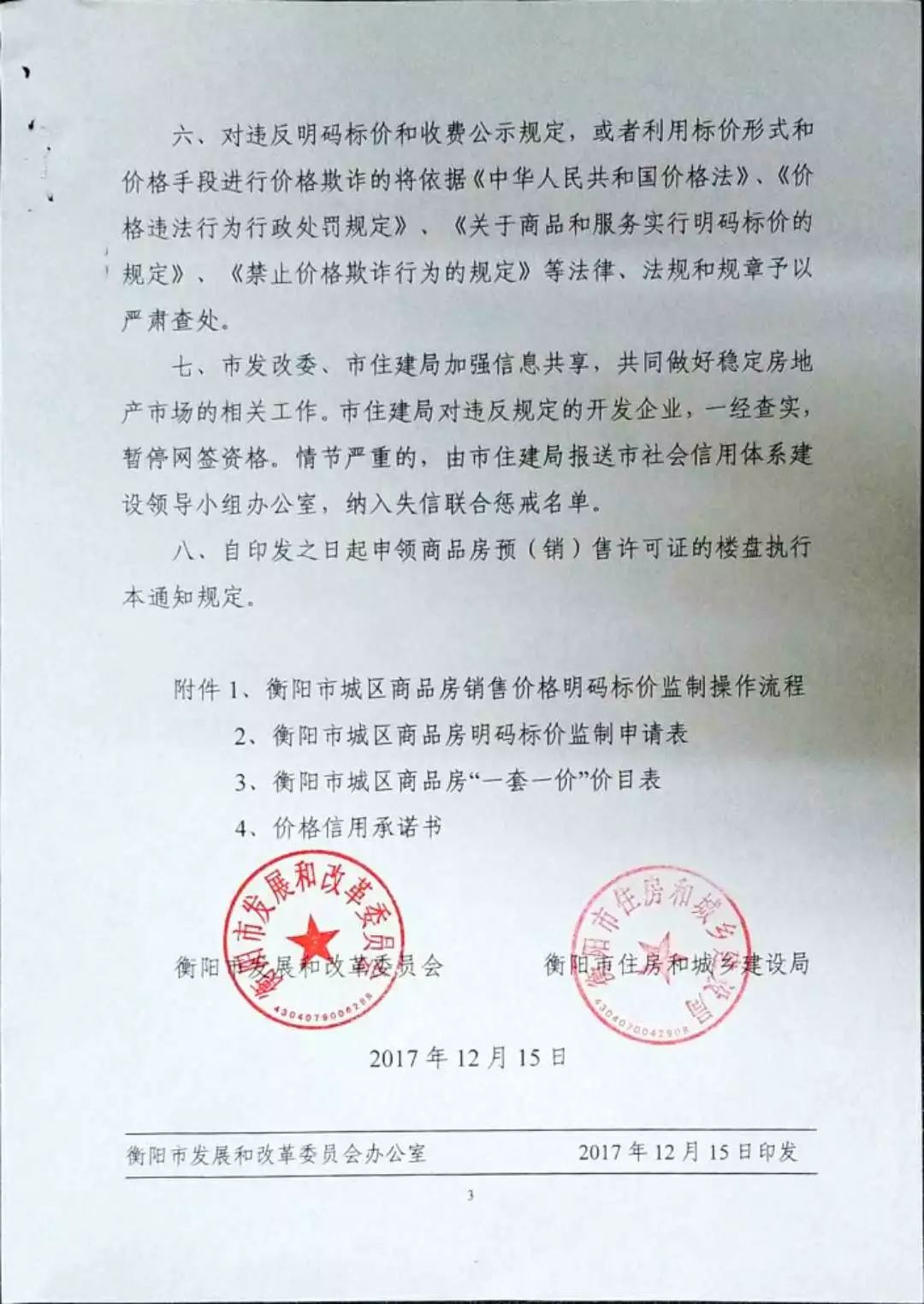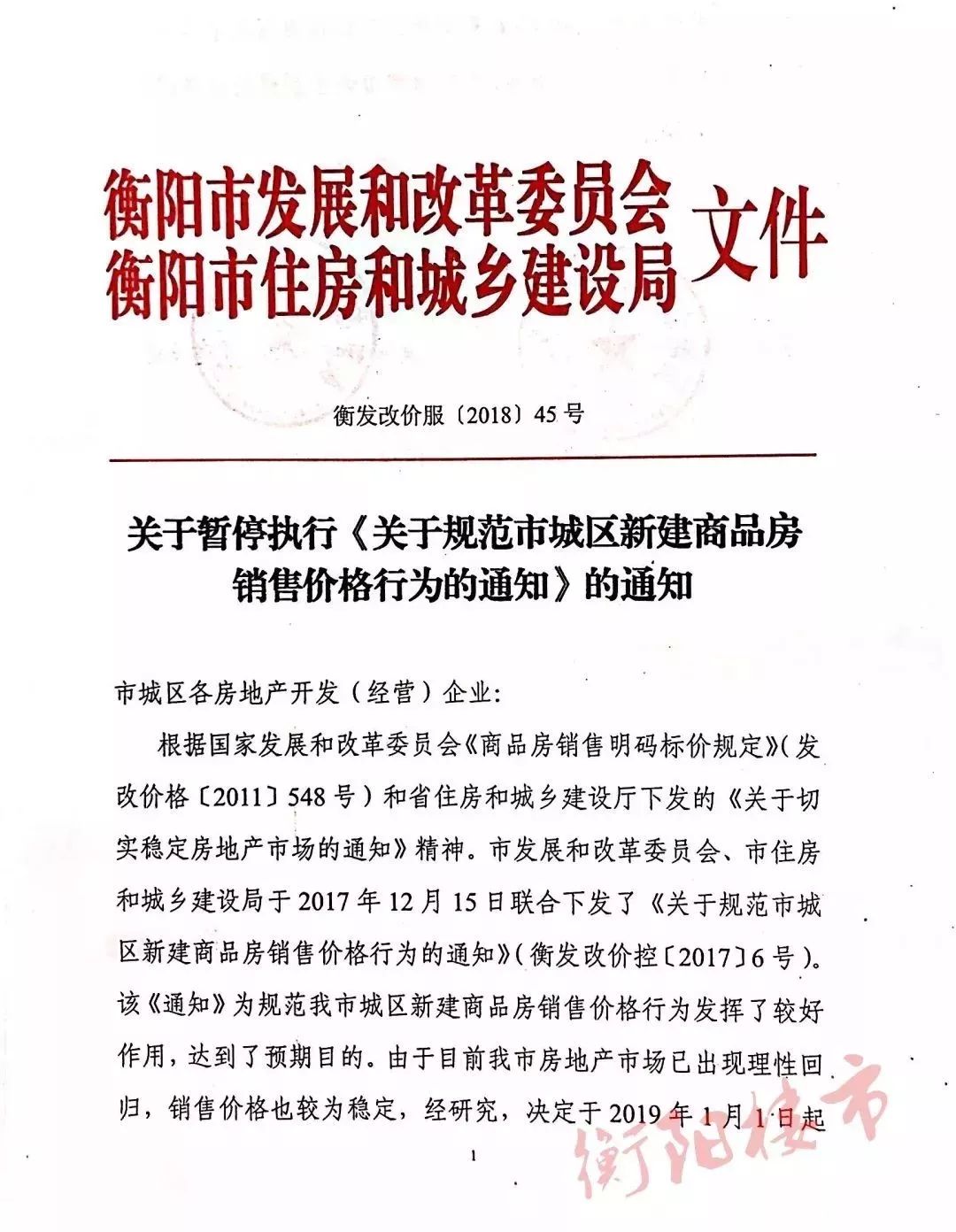 这份文件称,衡阳市发改委、住建局在2017年12月15日联合下发了《关于规范市城区新建商品房销售价格行为的通知》(衡发改价控【2017】6号),该通知对规范衡阳市城区新建商品房销售价格发挥了较好作用,达到了预期目的。