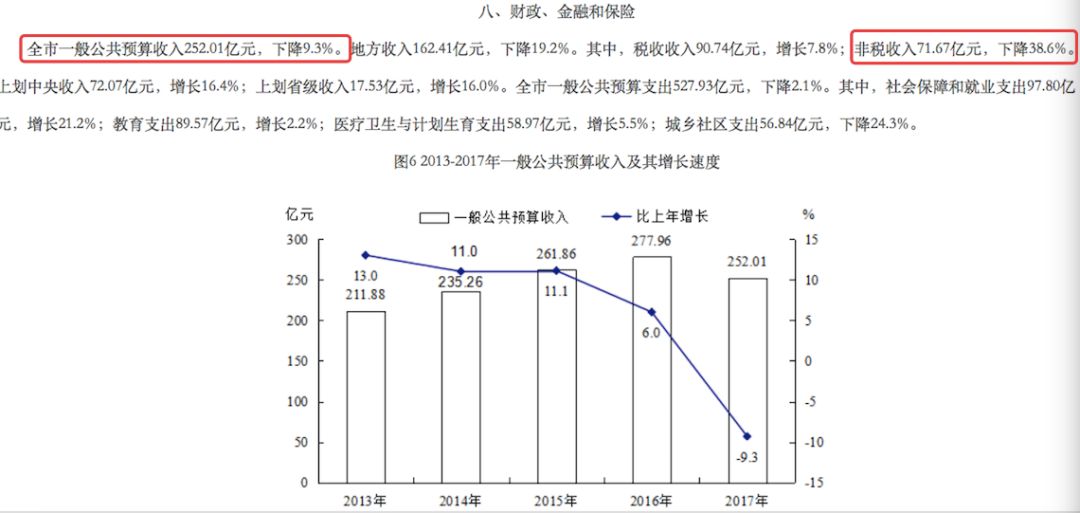 2017年,全市一般公共预算收入252.01亿元,下降9.3%。地方收入162.41亿元,下降19.2%。其中,税收收入90.74亿元,增长7.8%;非税收入71.67亿元,下降38.6%(注:土地收入包含在非税收入中)。