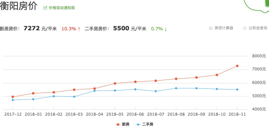 2018年衡阳房价也在继续上涨。吉屋网发布的数据显示,2018年11月,衡阳新房价格为7272元/平方米,环比增长10.3%,同比增长50%;二手房均价为5500元/平方米,同比增长18.4%,环比微跌0.7%。
