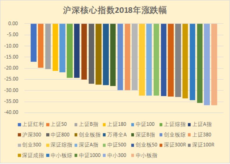 2018年,沪深核心指数的跌幅都超过了15%。截至12月25日,上证综指的年内跌幅是24.26%,沪深300指数的年内跌幅是25.15%,深证成指的年内跌幅是33.59%,创业板指的年内跌幅是27.34%。