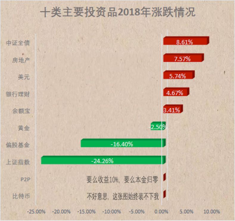 中证君统计了10类主要投资品2018年的收益率数据,结果显示:2018年要想赚钱,如果不考虑现金存款类产品的话,似乎只有4个选项:买债券、换美元、买房子,或者去巴西、印度炒股。其他选项,随随便便就能把你亏哭……