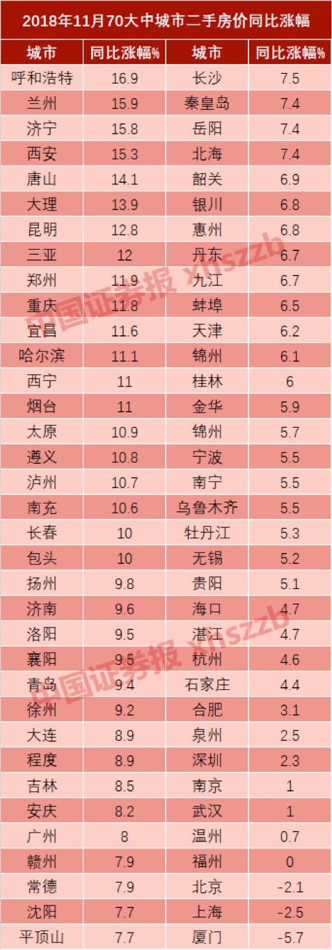 国家统计局发布的11月数据显示,在70个大中城市中,只有厦门和深圳两个城市的新房价格低于去年同期,其余68个城市均出现不同程度上涨。二手房价格数据同样如此,在70个大中城市中,仅有3个城市的二手住宅价格低于去年同期,分别是北京、上海、厦门。