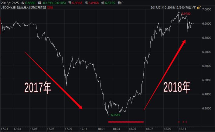 美元兑人民币汇率,在2016年12月28日创下高点6.9666,随后一路下跌。进入2018年,在2月7日创下低点6.2519后,逐渐一路上扬,10月31日达到高点6.9780。截至12月25日,今年以来美元兑人民币累计升值5.74%。这意味着,如果你去年底兑换5万美元,现在已经赚了1.87万元人民币。