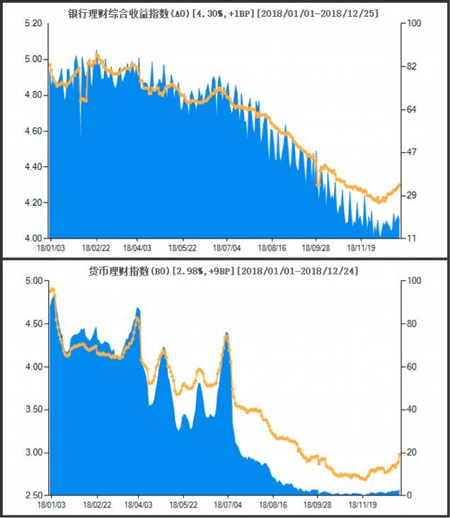 金牛理财网数据显示,银行理财综合收益指数今年以来一路下行,从年初的4.97%回落到了12月21日的4.3%,今年平均水平为4.67%。今年以来货币基金的收益率出现较大下滑,货币理财指数从年初的4.88%锐减到了12月25日的2.98%,今年平均水平为3.59%。