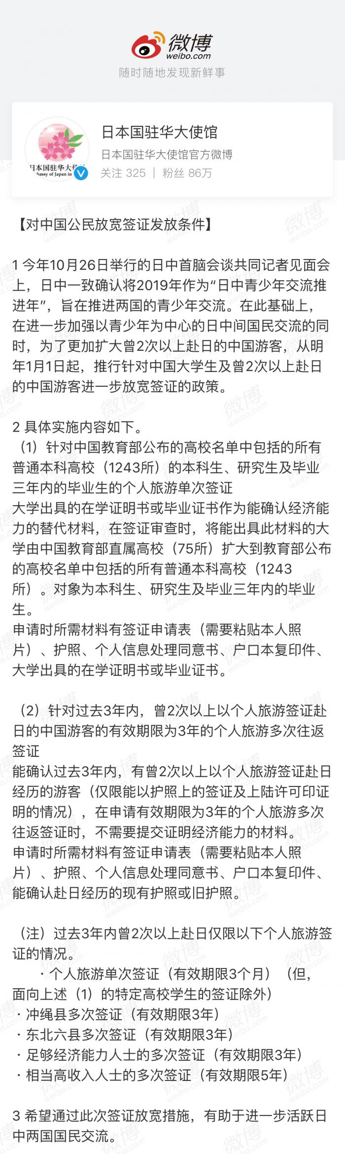 今年10月底,安倍晋三访华时,就传出日本将对中国公民放宽签证的消息,昨天,日本驻华大使馆通过官方微博正式发文,公布签证放宽实施细则。21世纪经济报道记者了解到,新的签证政策将于2019年1月1日起执行,具体将针对中国大学生及曾2次以上赴日的中国游客进一步放宽签证政策,免去财力证明资料等。