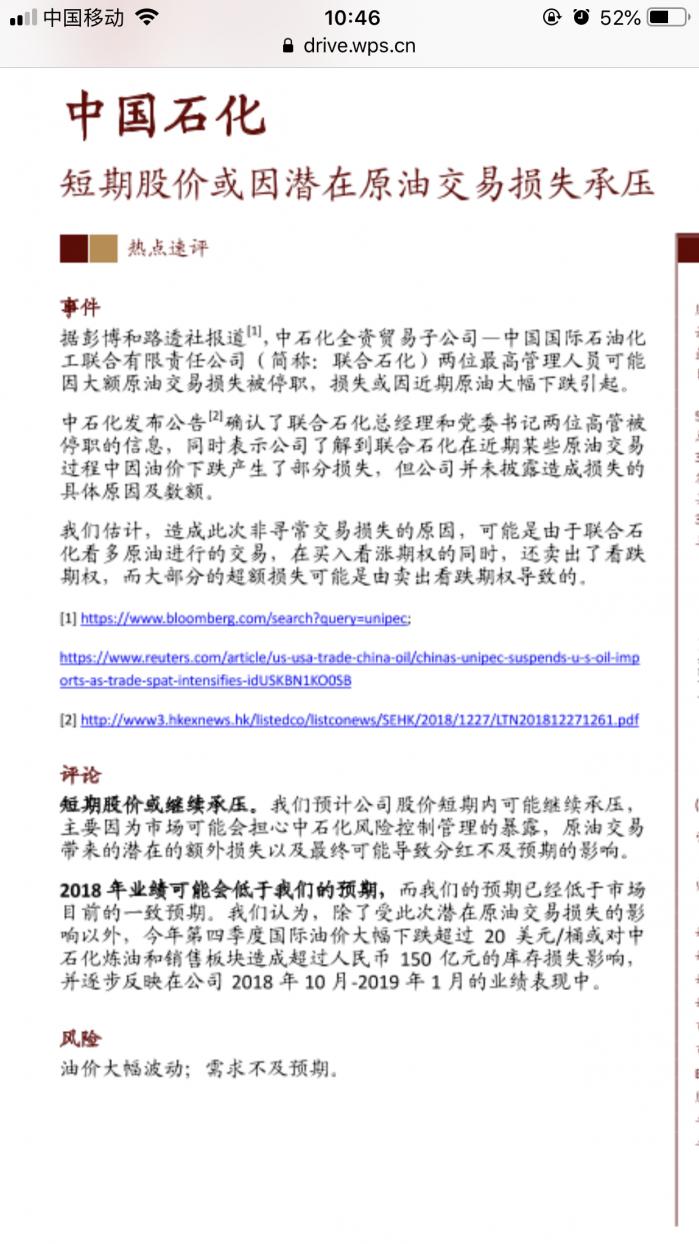 因此,中金认为,中国石化股价短期内可能继续承压,主要因为市场可能会担心公司风险控制管理的暴露,原油交易带来的潜在额外损失以及最终导致分红不及预期的影响。