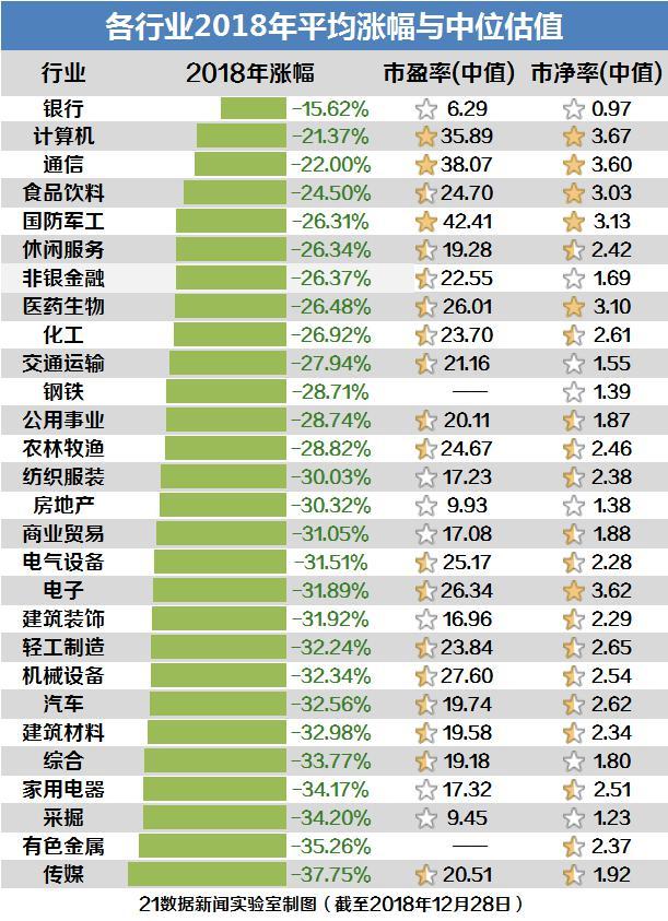 据21数据新闻实验室统计,2018年,28个申万一级行业无一收阳,仅银行、计算机、通信、食品饮料这4个行业跑赢大盘。