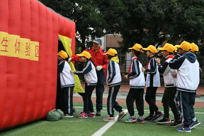 (孩子们正在教官的指导下进行消防安全教育演练)