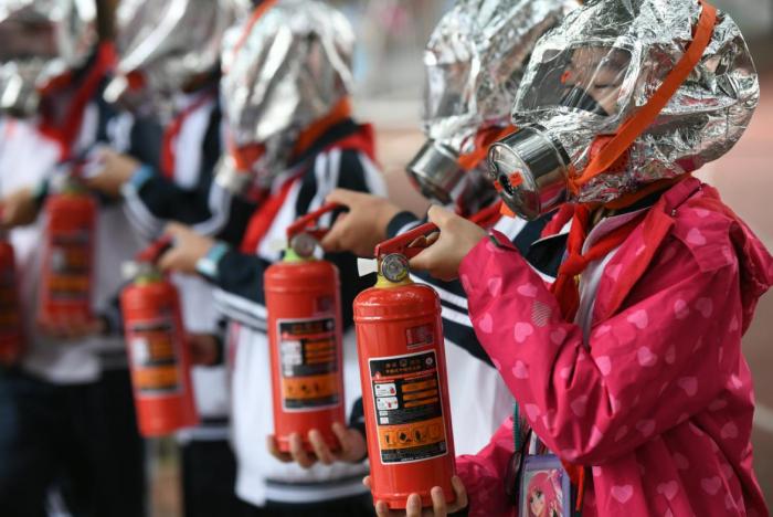 (孩子们戴上防毒面具,进行喷射灭火器实操演练)