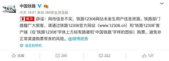 不过在当日晚间,中国铁路总公司官方微博同样辟谣:铁路12306网站未发生用户信息泄漏。