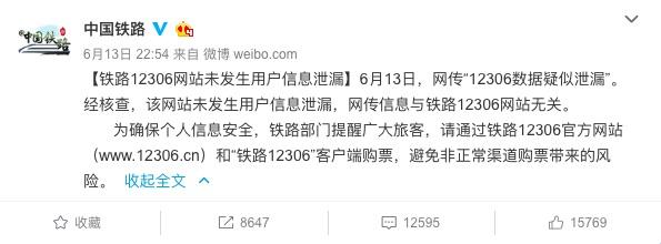 不过,围绕网传12306网站用户信息泄露一事,中铁总当日通过官方微博回应称,网传信息不实,铁路12306网站未发生用户信息泄露。